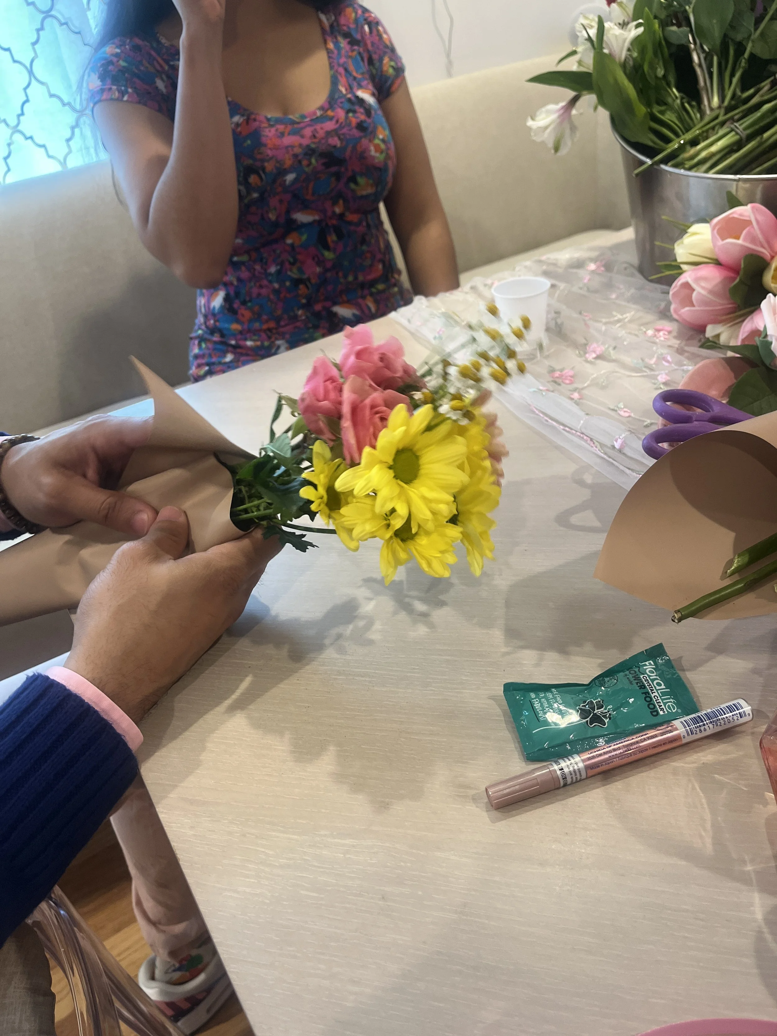 I created a simple station where guests could build their own bouquets using fresh flowers. I provided wrapping materials and added floral wrapping paper for bouquets so everyone could take their arrangement home.